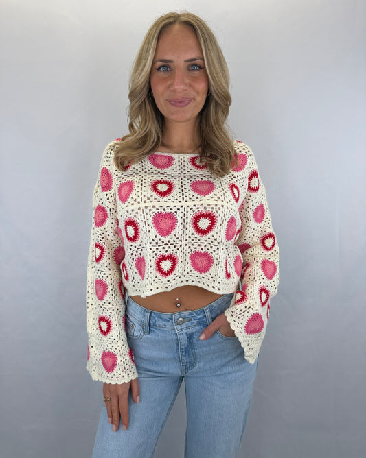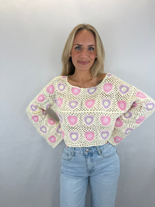 Langarmshirt gehäkelt Namida - beige/rot/pink